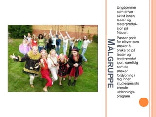 MålgruppeUngdommer som driveraktivt innen teater og teaterproduk-sjon på fritiden. Passer godt for elever som ønsker å bruke tid på teater og teaterproduk-sjon, samtidig som de ønsker fordypning i fag innen studiespesialiserende utdannings-program
