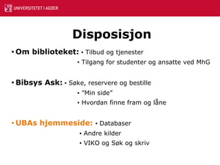 Disposisjon Om biblioteket: ▪ Tilbud og tjenester ▪ Tilgang for studenter og ansatte ved MhG Bibsys Ask: ▪ Søke, reservere og bestille ▪ ” Min side” ▪ Hvordan finne fram og låne UBAs hjemmeside: ▪ Databaser ▪ Andre kilder ▪ VIKO og Søk og skriv