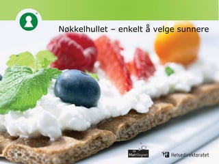 #5 Merkeordningen Nøkkelhullet er ett av flere tiltak i regjeringens handlingsplan for bedre kosthold i befolkningen, ”Oppskrift for et sunnere kosthold”. Nøkkelhullet vil kunne hjelpe folk med å velge matvarer som inneholder mer fiber, og mindre fett, salt og sukker i forhold til andre tilsvarende produkter. Den skal gjøre det enklere for forbrukerne å gjøre et sunnere valg i en ofte travel handlesituasjon, samtidig som vi håper den vil bidra til produktutviklingen hos produsentene. På sikt kan ordningen slik være med å bidra til å utjevne sosiale ulikheter i helse.
