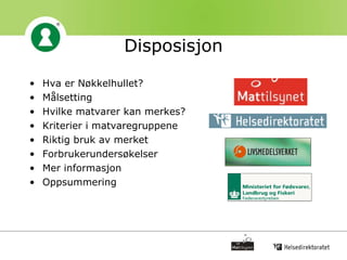 Disposisjon Hva erNøkkelhullet? Målsetting Hvilke matvarer kan merkes? Kriterier i matvaregruppene Riktig bruk av merket Forbrukerundersøkelser Mer informasjon Oppsummering