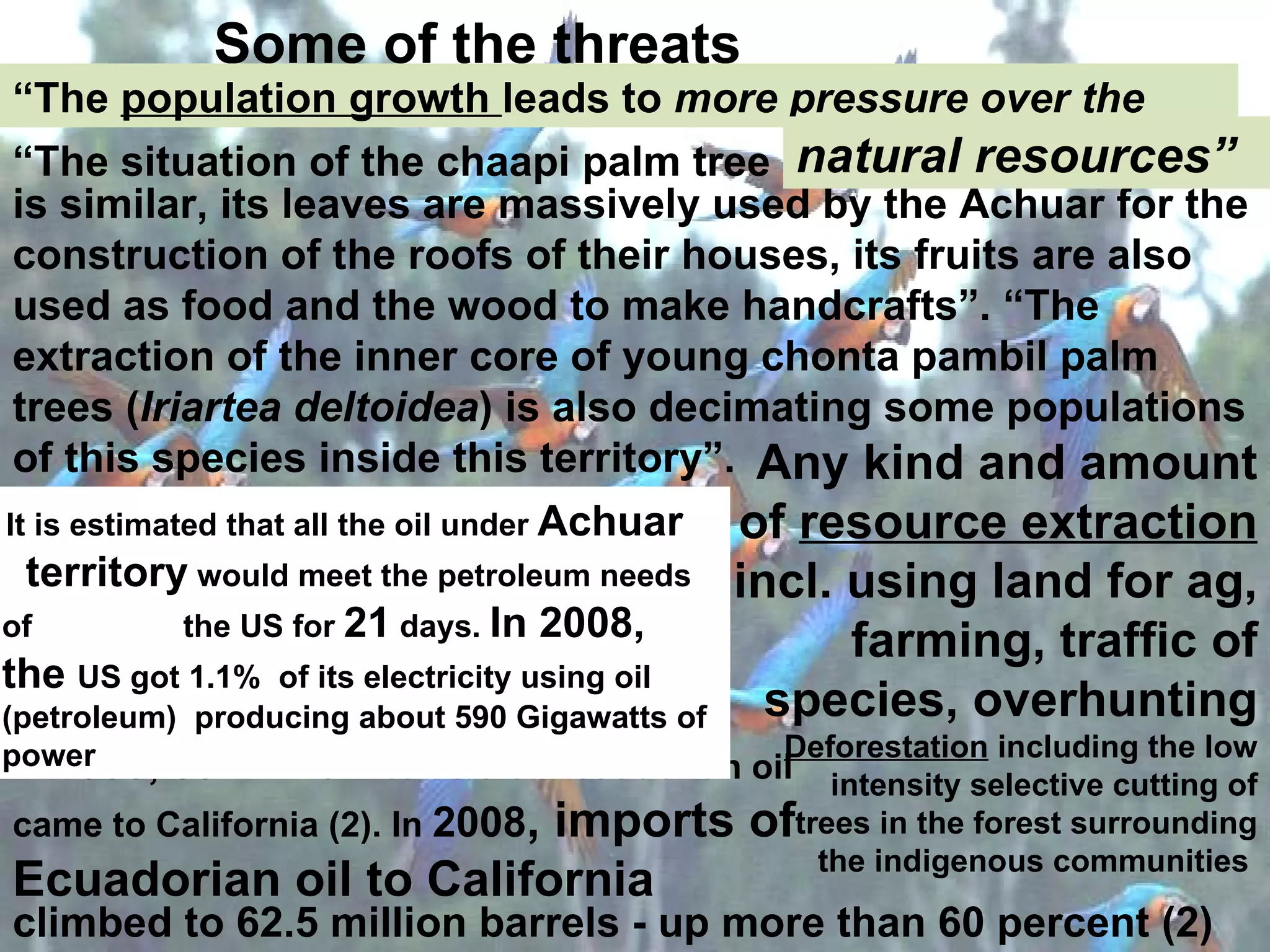 The document discusses threats to indigenous Achuar lands and resources in Ecuador from activities like deforestation, overhunting, and oil extraction. It notes population growth is putting more pressure on natural resources and describes how extraction of materials from certain tree species is decimating some populations. The document also provides information about biodiversity in Achuar lands, including many species of trees, fish, and birds, and benefits to Western medicine from plants found there.