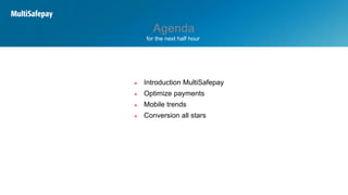 This document discusses how to optimize online and mobile payments. It introduces MultiSafepay, which offers payment solutions including online payments, mobile solutions, billing solutions, and Pay After Delivery. It provides an overview of MultiSafepay's services including 15 years of experience, 70 payment experts, and support for 10,000+ merchants. The document then discusses trends in mobile commerce, integration with platforms like Magento, and tools to boost conversion rates such as fraud prevention and custom payment pages.