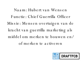 Naam: Hubert vanWensen Functie: Chief Guerrilla Officer Missie: Mensen overtuigen van de kracht van guerrilla marketing als middel om merken te bouwen en/of merken te activeren