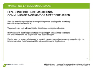 EEN GEÏNTEGREERDE MARKETING-COMMUNICATIEAANPAKVOOR MEERDERE JARENVoor de meeste organisaties is een geïntegreerde strategische marketing communicatieaanpak nieuw. Vaak gaat men met ad-hoc ideeën direct naar een reclamebureau. Hiermee wordt de strategische fase overgeslagen en daarmee ontbreekt het fundament voor het slagen van veel doelstellingen.Zonder een gedegen geïntegreerde marketing- communicatieaanpak op lange termijn zal iedere vorm van reclame nauwelijks tot geen rendement opleveren.