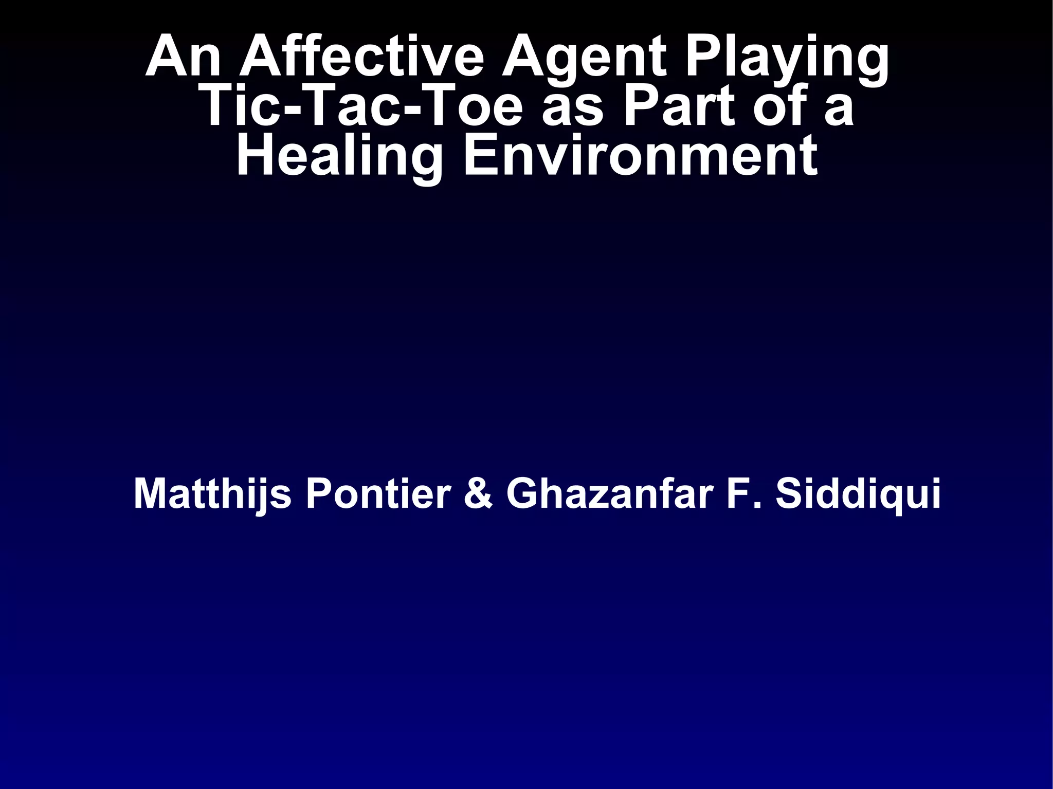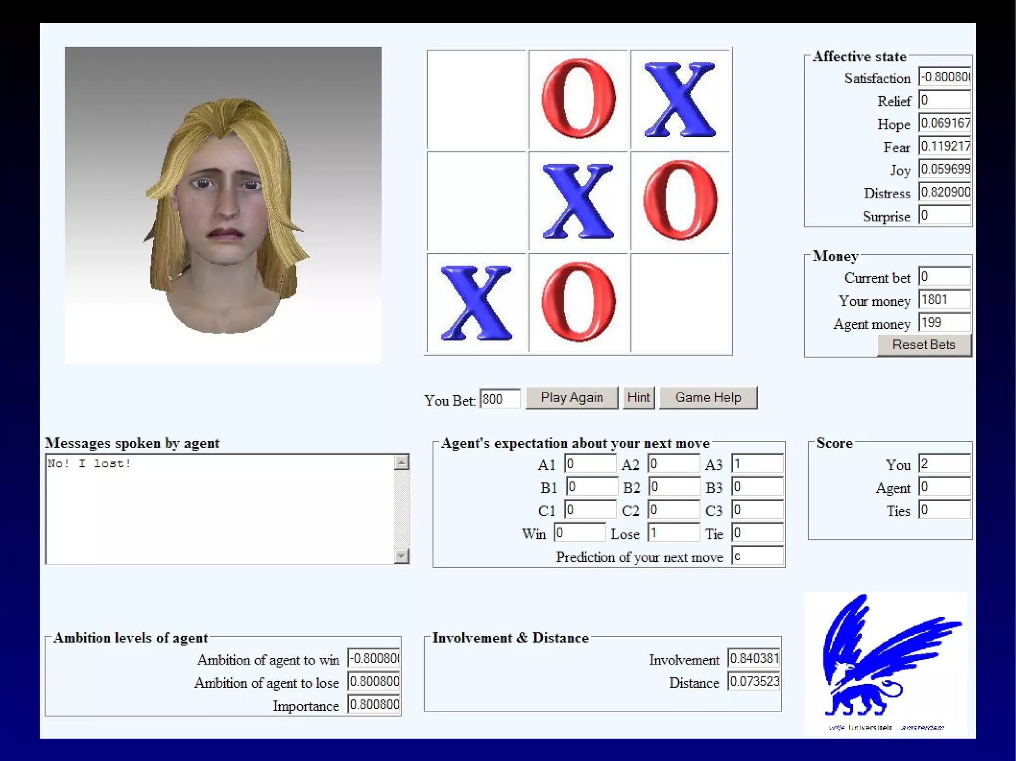 The document describes an affective virtual agent that can play tic-tac-toe and is designed to simulate human-like emotional behavior and decision making. The agent incorporates three models - I-PEFiC, EMA, and CoMERG - to simulate affective decision making, emotions, and emotion regulation strategies. Different configurations of the agent allow it to try to win, try to lose, or make decisions based on its simulated emotional state and the game context. The agent is proposed as a pilot application for an artificial companion that could help reduce loneliness.