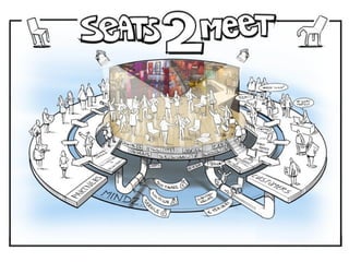 The document discusses trends related to the digital revolution and changing nature of work. It mentions concepts like knowledge workers ("knowmads") who can work anywhere anytime, asynchronous collaboration, crowd collaboration, and the blurring line between virtual and real. It then introduces the company Seats2meet.com which offers shared workspaces and meeting spaces with wifi, food, and drinks in exchange for contributions to building their online network. The goal is to facilitate serendipitous connections, sharing of knowledge, and global inspiration on a local level to generate business opportunities. An app is mentioned as a way to further connect people and information.
