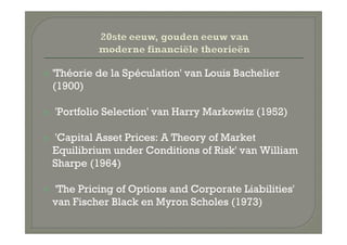 'Théorie de laSpéculation' van Louis Bachelier (1900) 'Portfolio Selection' van Harry Markowitz (1952) 'Capital Asset Prices: A Theory of Market Equilibrium under Conditions of Risk' van William Sharpe (1964) 'The Pricing of Options and Corporate Liabilities' van Fischer Black en Myron Scholes (1973)