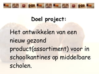 Marktonderzoek Conclusies: Inde huidige schoolkantines op middelbare scholen is genoeg plaats voor nieuwe gezonde producten, vooral als deze erg innoverend zijn. Om overgewicht terug te dringen, moeten jongeren gezondere producten eten en minder calorieën innemen. Jongeren hebben wel behoefte aan gezonde producten, maar smaak en uitstraling zijn voor hen de allerbelangrijkste productcriteria.