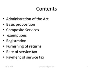 Dr. Sanjay P. Sawant Dessai's presentation on service tax for B.Com (Taxation) students at Goa University outlines the administration, structure, and exemptions related to service tax. The talk details the service tax history, including rates and collection over the years, alongside the negative list which specifies non-taxable services. Key points include registration requirements, filing returns, the payment schedule, and penalties for non-compliance.