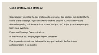 Business development involves creating long-term value for a company through customers, markets, and relationships. This includes generating cash, opportunities, sustainability, competitive advantage, customer discovery, debt repayment, problem solving, and building strategic alliances. Business development is a strategic activity focused on growth, not just sales. Effective communication, both personal and professional, is important for business development and relies more on how something is said rather than just what is said. Key factors like employee and customer satisfaction, productivity, efficiency, and culture are also essential for business growth and success.