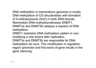 The document discusses new epigenetic tools for cancer diagnostics, particularly focusing on DNA methylation and its regulation by DNA methyltransferases like DNMT3. It compares traditional methods like bisulfite treatment with newer enzymatic approaches such as methyl-sensitive PCR assays and the recently developed glad-PCR assay for better detection of DNA methylation status in tumor suppressor genes. The findings suggest that the glad-PCR assay offers enhanced sensitivity and specificity for clinical applications in characterizing cancer-associated methylation patterns.
