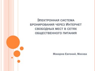 Документ описывает бизнес-идею создания интернет-системы бронирования мест в заведениях общественного питания, направленную на упрощение поиска и резервирования столиков для клиентов, а также на сокращение затрат для владельцев ресторанов. Основная целевая аудитория - малые и средние предприятия общественного питания, а финансовые ожидания включают доход в 300-500 тыс. рублей в месяц с окупаемостью проекта в 1-2 года. Документ также упоминает отсутствие конкурентов в данной нише и возможные преимущества для клиентов и ресторанов от использования платформы.