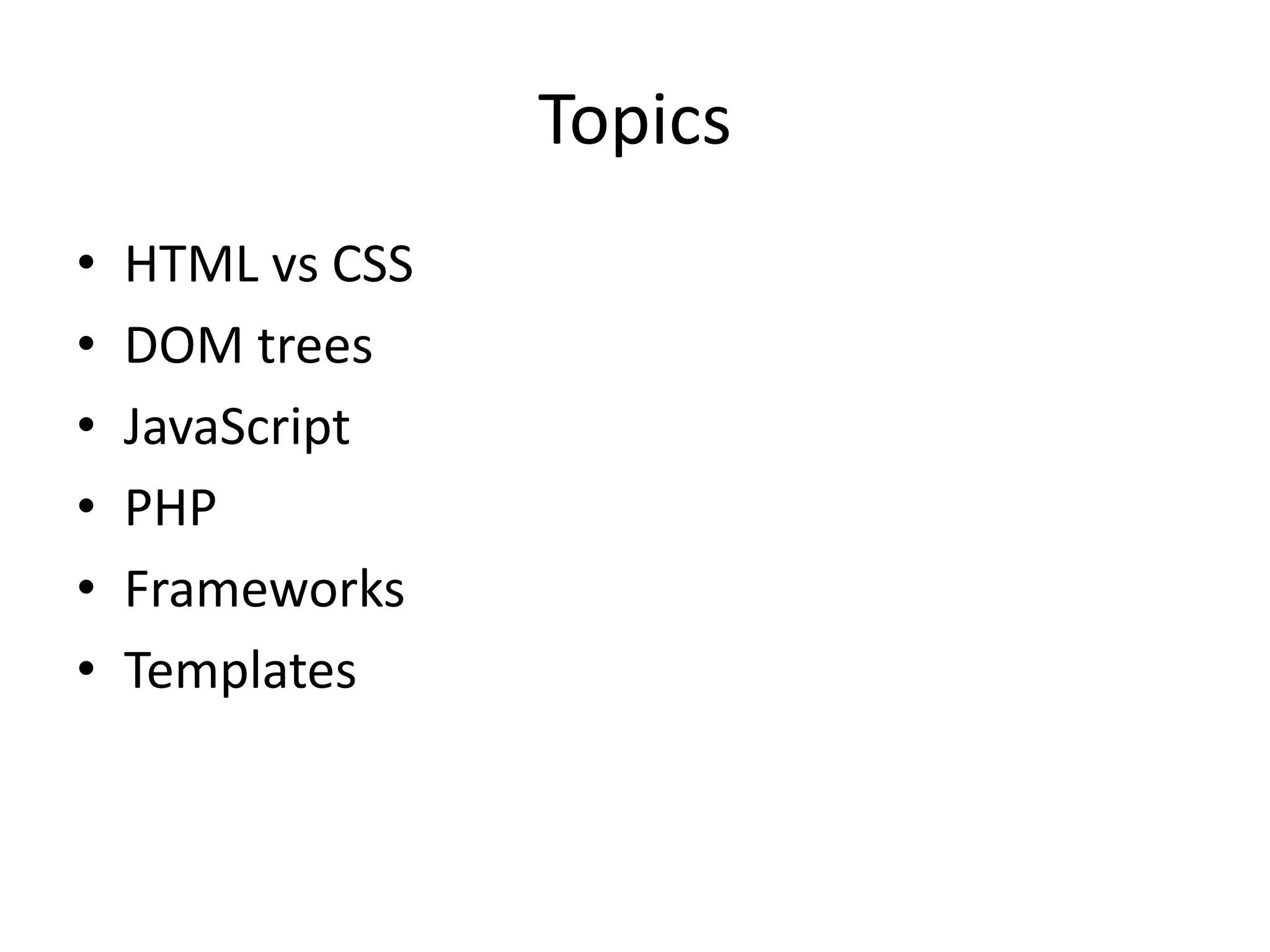 This document provides an overview of various web development topics including: HTML vs CSS, DOM trees, JavaScript, PHP, frameworks, and templates. It discusses how HTML defines content while CSS handles presentation. JavaScript adds interactivity. PHP dynamically generates HTML on the server. Frameworks provide structure and utilities to speed development using patterns like MVC. Templates organize page layout. Frameworks offer benefits like file organization, security, and community support for teamwork. A variety of popular frameworks and template options are presented.