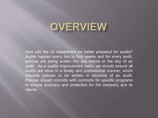 The QI department needs to better prepare for audits by writing policies and procedures in advance rather than the day of or before audits. Having up-to-date policies that align with contracts will help ensure accuracy, protect the company and clients, and could lead to more funding and accreditation. The document outlines a plan where program directors will provide revised policies and procedures to QI specialists on a quarterly basis to maintain updated policies aligned with contracts.