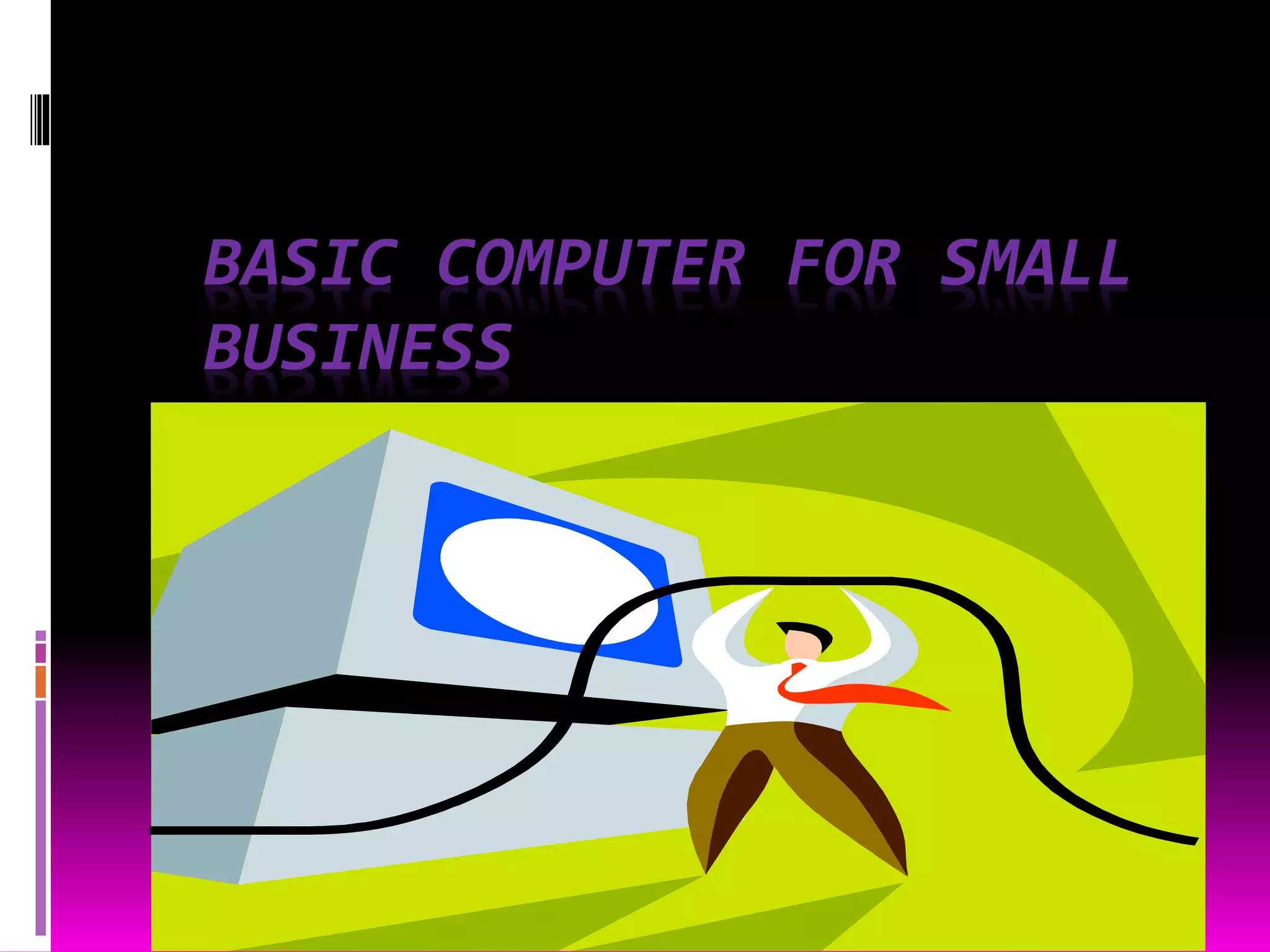 This document provides an overview of basic computer hardware, software, and concepts for small businesses. It includes sections that define computers and their main parts, examples of common hardware and software, input and output devices, and how the basic components of a computer work together. The document also includes a basic computer quiz and definitions of key computer terms.