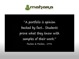 The document outlines a session on Mahara eportfolios, providing guidance on creating personal and group portfolios, and emphasizing collaboration and multimedia integration. It includes various activities focused on reflecting on learning experiences and utilizing social networking within Mahara. Additionally, it highlights the sustainability of eportfolios for lifelong learning and their application in educational settings.