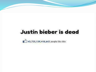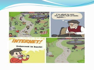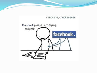 This document discusses social media, including what it is, popular platforms, usage statistics, and effects. It defines social media as interaction between people online to share and exchange information. Popular platforms mentioned include WhatsApp, Twitter, Facebook, YouTube, and Instagram. Statistics show Facebook has over 2 billion yearly active users. Both positive effects like making connections worldwide and negative effects like distraction and lack of concentration are covered. The document concludes with tips for limiting social media use such as turning off notifications and developing new hobbies.