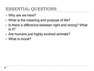 This document discusses worldviews and provides definitions, essential questions, and verses related to developing a Christian worldview. It defines a worldview as a way of interpreting all of reality and discusses key perspectives like what is God and what is humanity. The goal of developing a Christian worldview is to think consistently from a biblical perspective and engage culture without compromise as a faithful disciple of Christ.