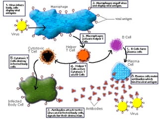 The document summarizes key concepts of the human immune system. It describes both innate, nonspecific defenses like skin barriers and phagocytes, as well as acquired, specific defenses mediated by lymphocytes and antibodies. The immune system protects against pathogens through both humoral responses involving B cells and antibodies, and cell-mediated responses involving T cells. Memory responses provide faster protection upon reexposure to pathogens.