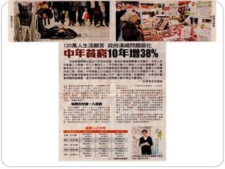 貧窮 是甚麼? Fundamentally,poverty is a denial of choices ( 選擇 ) and opportunities ( 機會 ), a violation of human dignity ( 尊嚴 ). It means lack of basic capacity to participate effectively in society ( 參與社會 ). (UN , Statement of Commitment for Action to Eradicate Poverty , June 1998 – signed by the heads of all UN agencies)