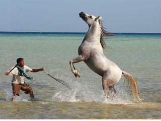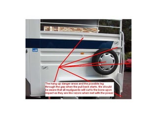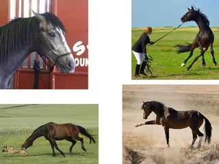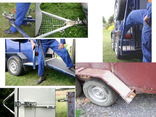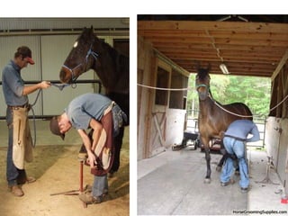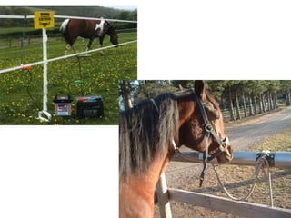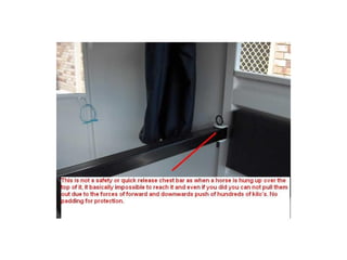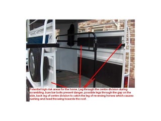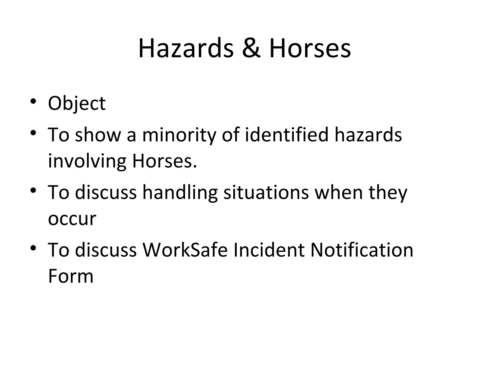 Horses can pose hazards and this document discusses performing safety checks when transporting horses, potential behaviors that could lead to injuries, and general hazards to be aware of. It also provides information on reporting incidents using a WorkSafe Incident Notification Form.