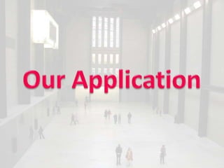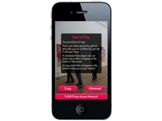 The document discusses ideas for an augmented reality game that could be played at an art gallery. It considers whether the game should focus on one artist's work or include multiple artists. It also asks about different age ranges and difficulty levels. Potential rewards for players are mentioned. Examples of existing AR uses and hardware are provided. The proposed game would have players find keys or pieces of artworks throughout the gallery using AR. Hints, difficulty levels, time limits, and prizes are discussed.