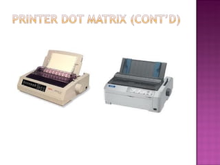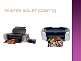 Dokumen ini menjelaskan berbagai jenis printer, termasuk dot matrix, inkjet, dan laser, serta fitur dan keunggulan masing-masing. Printer dot matrix dikenal dengan biaya rendah tetapi kualitas cetak yang kurang baik, sementara printer inkjet dan laser menawarkan kualitas dan kecepatan tinggi meskipun dengan harga yang lebih mahal. Setiap jenis printer memiliki kelebihan dan kekurangan yang berbeda tergantung pada kebutuhan cetak yang diinginkan.