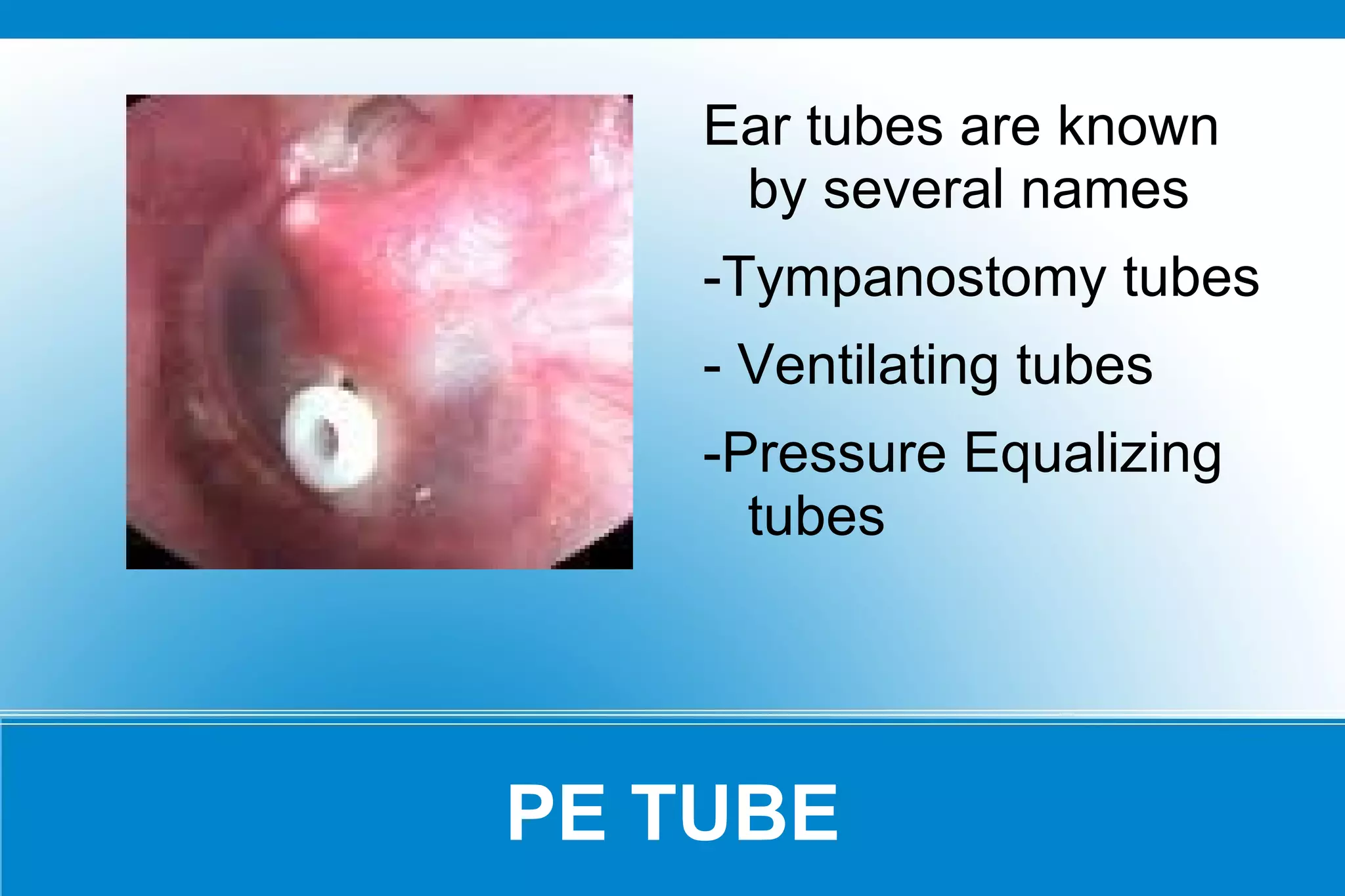 Ear tubes, also known as tympanostomy, ventilating, or pressure equalizing tubes, are small tubes surgically placed in the eardrum to help equalize pressure and drain fluid from the middle ear, helping to treat middle ear inflammation or otis media. The document also defines several eye and vision related terms including emmetropia describing normal vision, exotropia referring to an outward turning eye, extraocular movement describing the six muscles that control eye movement, and visual acuity measuring clarity of vision using a Snellen chart.
