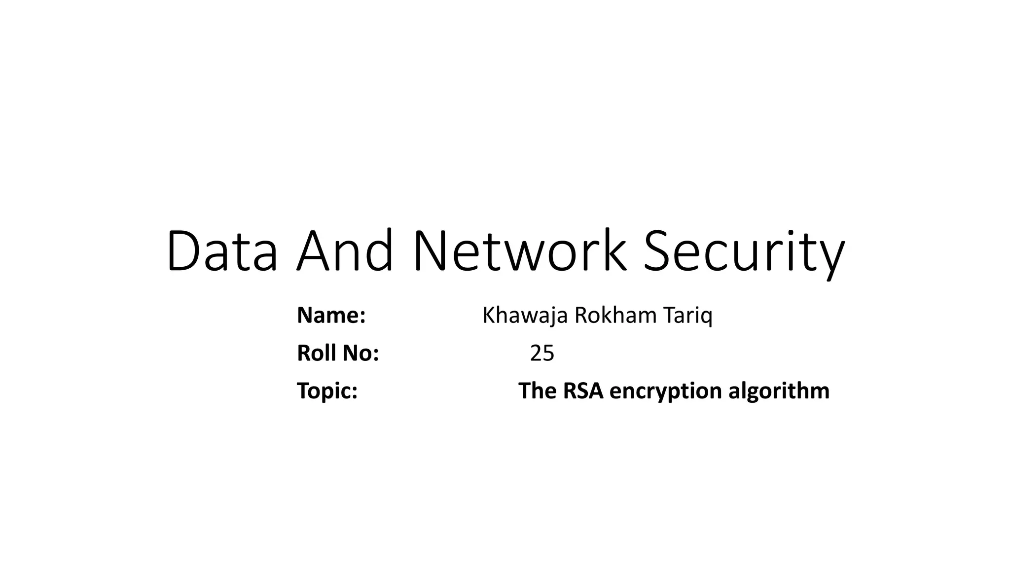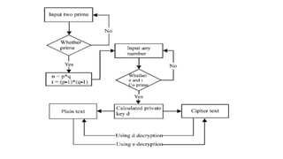 The RSA encryption algorithm is one of the most widely used public key encryption algorithms invented in 1977. It uses two large prime numbers to generate a public key and a private key. The public key is used to encrypt messages while the private key is used to decrypt them. RSA works by: 1) Generating two large prime numbers and computing n as their product, 2) Finding a number e that is coprime to another number m, 3) Finding d such that d*e is congruent to 1 modulo m, 4) Publishing e and n as the public key and keeping d and n as the private key.