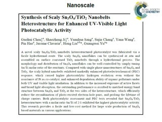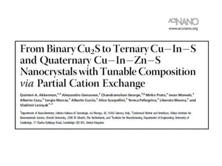 This document summarizes a literature presentation on the synthesis and characterization of Sn3O4/TiO2 nanobelt heterostructures and partial cation exchange synthesis of Cu2S, CIS, and CIZS nanocrystals. Various characterization techniques were used including XRD, SEM, HRTEM, EDS, UV-Vis, PL, and photoelectrochemical measurements. The Sn3O4/TiO2 heterostructures showed superior photocatalytic activity under UV and visible light due to efficient charge separation. The sequential and combined cation exchange syntheses of CIZS nanocrystals resulted in different structures and photoluminescence properties that were tunable based on the Cu:In:Zn ratio.
