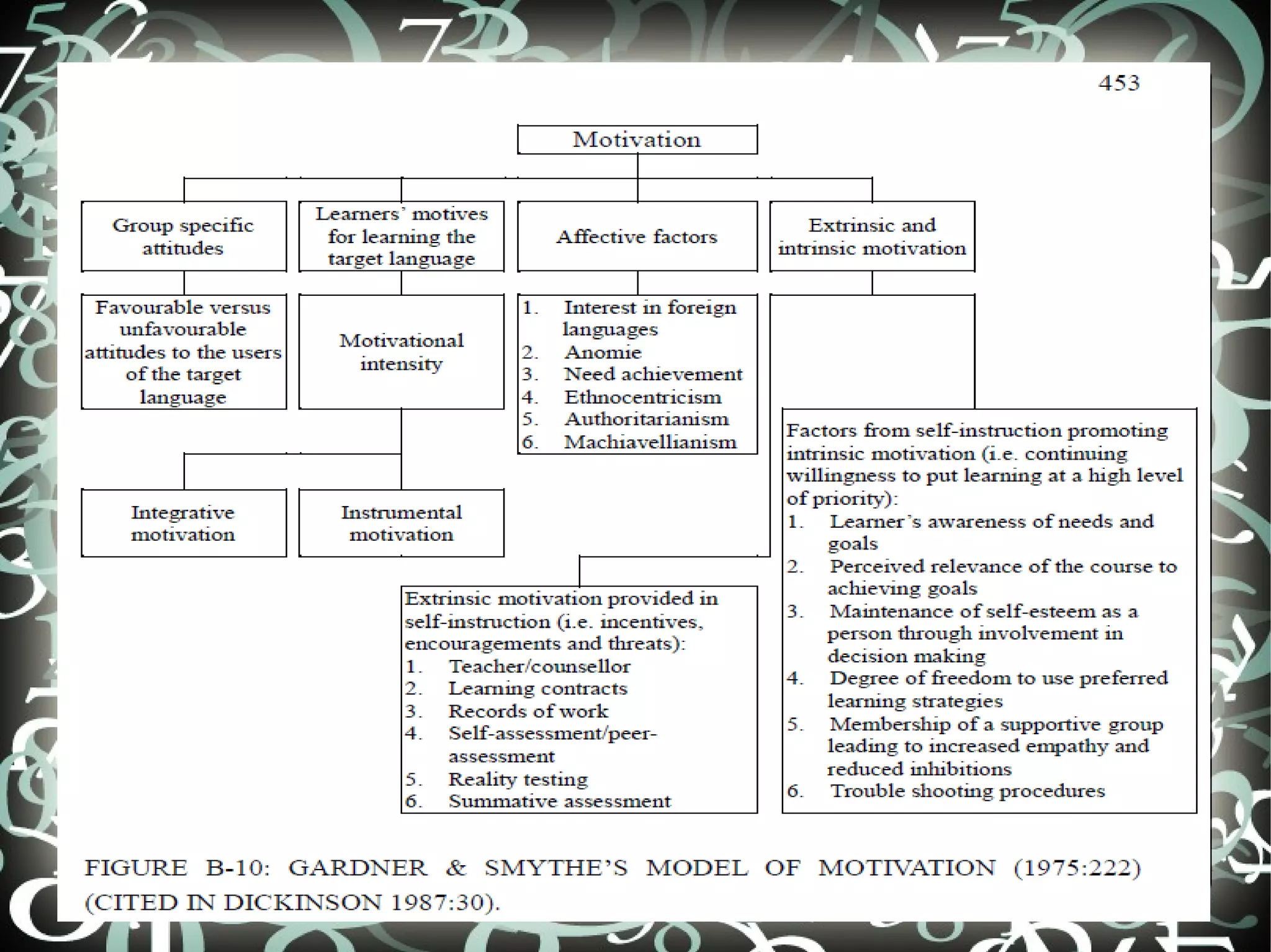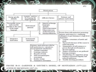 This document discusses several factors that can influence second language learning: motivation, age, gender, ethnicity/cultural background, and intelligence. For motivation, it describes how teachers can intrinsically and extrinsically motivate students. It notes that age affects how quickly adults versus children learn initially, but that starting younger allows for higher proficiency levels. Gender differences in learning strategy use are inconclusive between studies. Cultural background and first language can impact the learning process through issues like linguistic interference. Intelligence is difficult to separate from environment, but seems important for language rule learning.