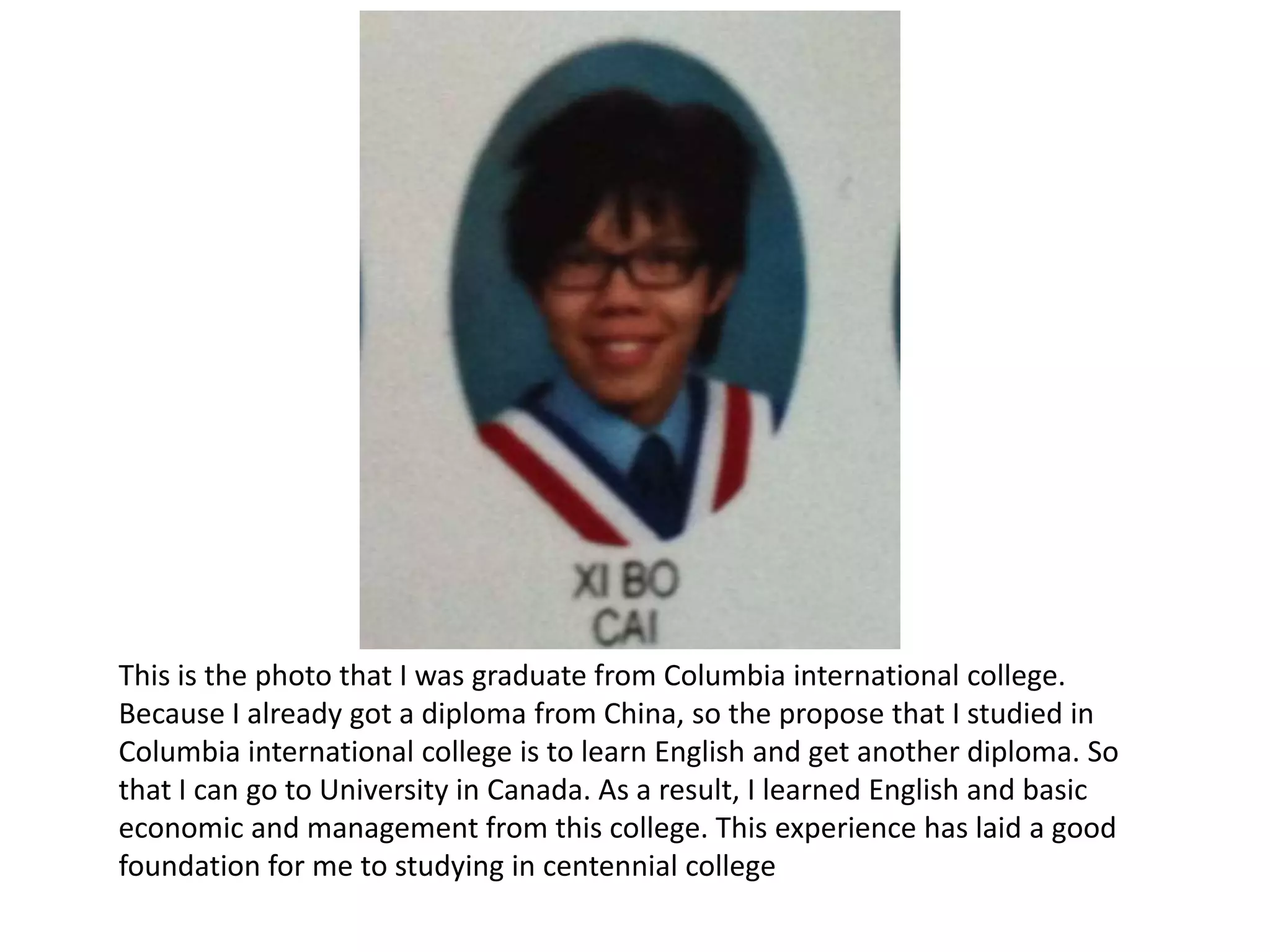 This document contains 5 photos from the author's life experiences that helped shape their path: 1) Graduating from Columbia International College to learn English and get a diploma to attend university in Canada, 2) Winning a table tennis tournament at age 17 after training 5+ hours daily, 3) Traveling to Canada 5 years ago, their first time, which greatly impacted their decision to stay and study in Canada, 4) Preparing for a class presentation and learning skills like clear voice, eye contact, and demonstrating full content knowledge, and 5) Volunteering to pick fruit for farmers, their first volunteer experience, which taught the value of hard work.