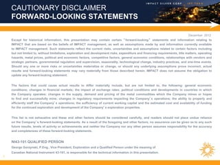 The document is a corporate presentation for IMPACT Silver Corp from December 2012. It summarizes that IMPACT operates two silver mining districts in Mexico, has a profitable track record of increasing silver production and earnings since 2006, and has a strong cash position with no debt. It also provides details on IMPACT's asset base, including active mines, development projects like the Capire Mine, and exploration potential across the districts.