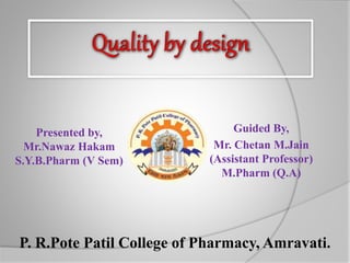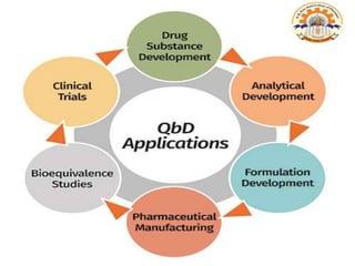 The document discusses the concept of Pharmaceutical Quality by Design (QbD), which is a systematic approach to pharmaceutical development that emphasizes product and process understanding based on sound science and quality risk management. QbD aims to design quality products and manufacturing processes that consistently deliver intended performance, following ICH guidelines Q8 on pharmaceutical development, Q9 on quality risk management, and Q10 on pharmaceutical quality systems. Implementing QbD provides benefits like eliminating batch failures, minimizing deviations, and ensuring consistent product quality.