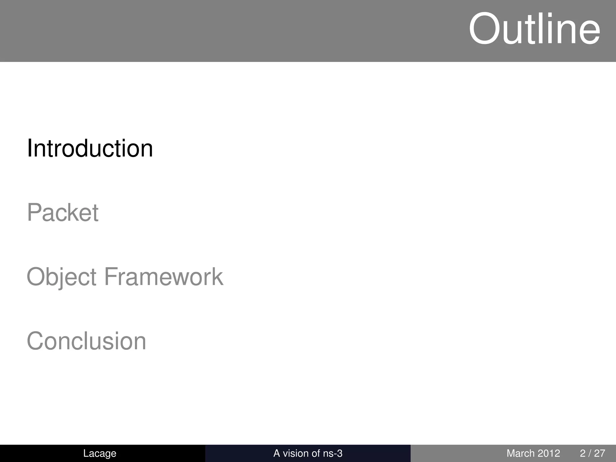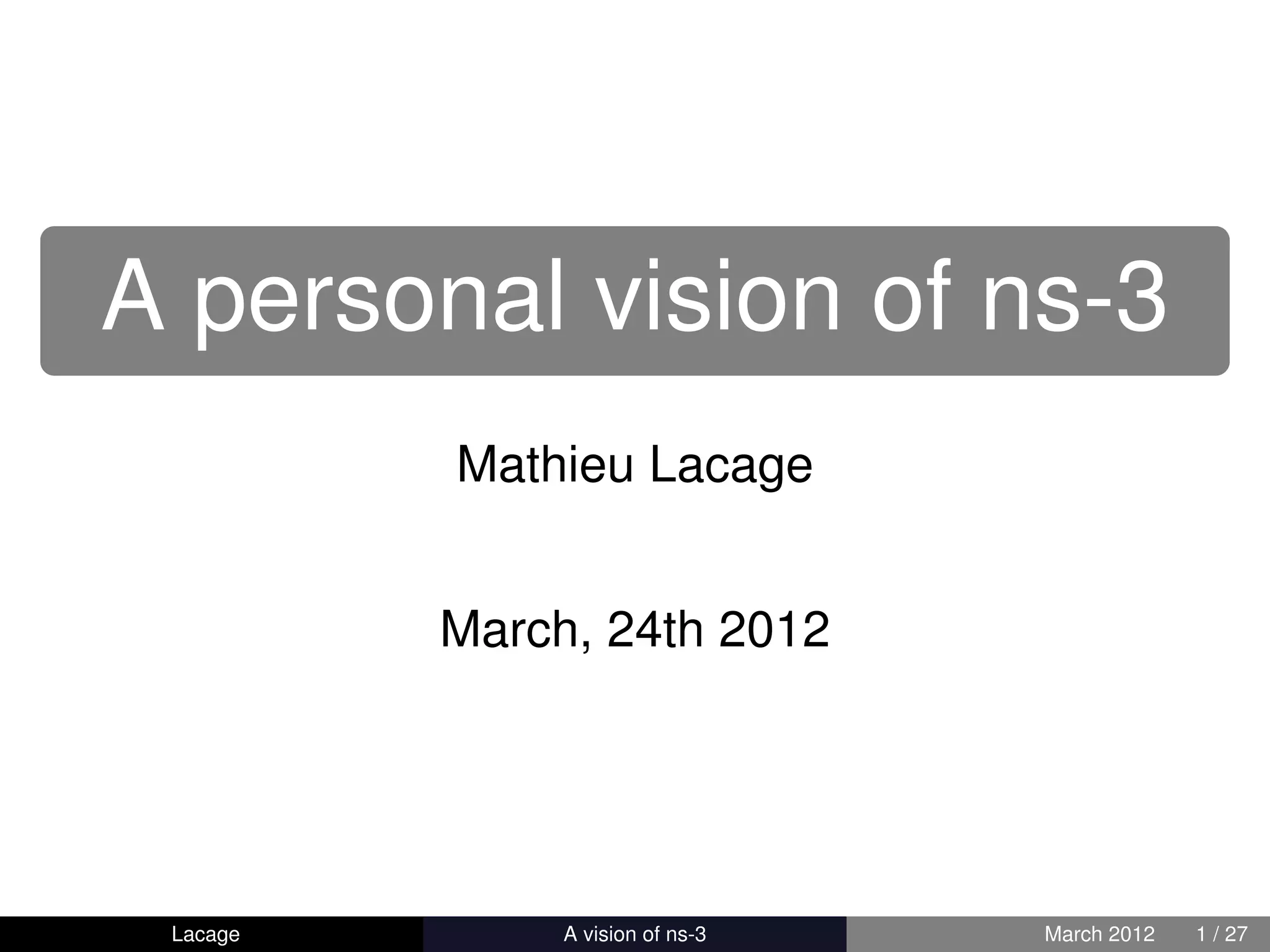 This document provides an overview of the history and future of the ns-3 network simulator project. It discusses how the project originated from multiple partners with different goals and requirements, including real-code integration, emulation, education, wireless modeling, and long-term sustainability. A key challenge was developing an open source community to support ongoing maintenance of the large and complex codebase. The document outlines how ns-3 addressed this by adopting an incremental development process and gaining community involvement and support over time.