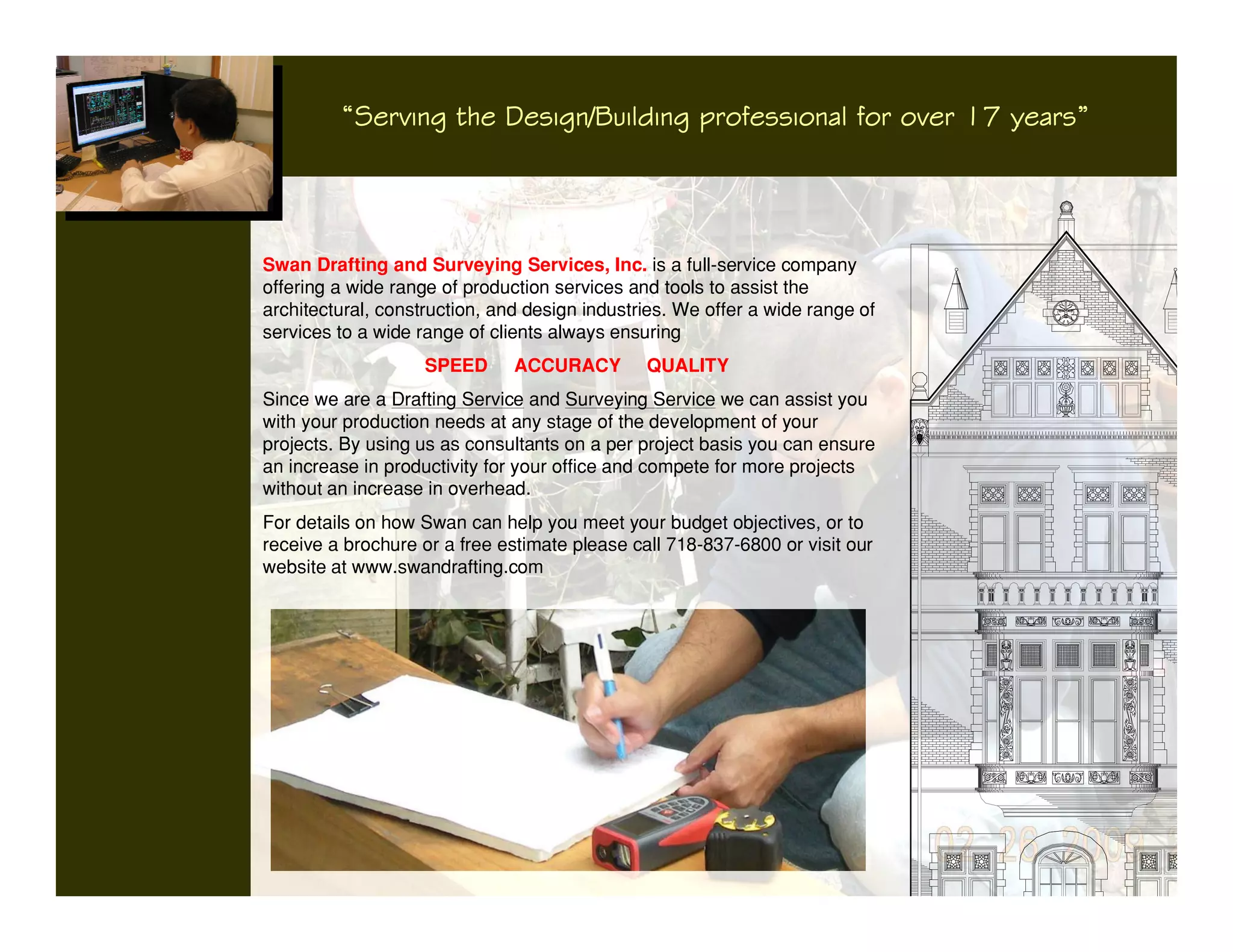 Swan Drafting and Surveying Services has served design and building professionals for over 17 years, offering a wide range of production services and tools. They provide speed, accuracy, and quality for all stages of projects. Clients can increase productivity and compete for more projects without increasing overhead by using Swan as consultants on a per project basis.
