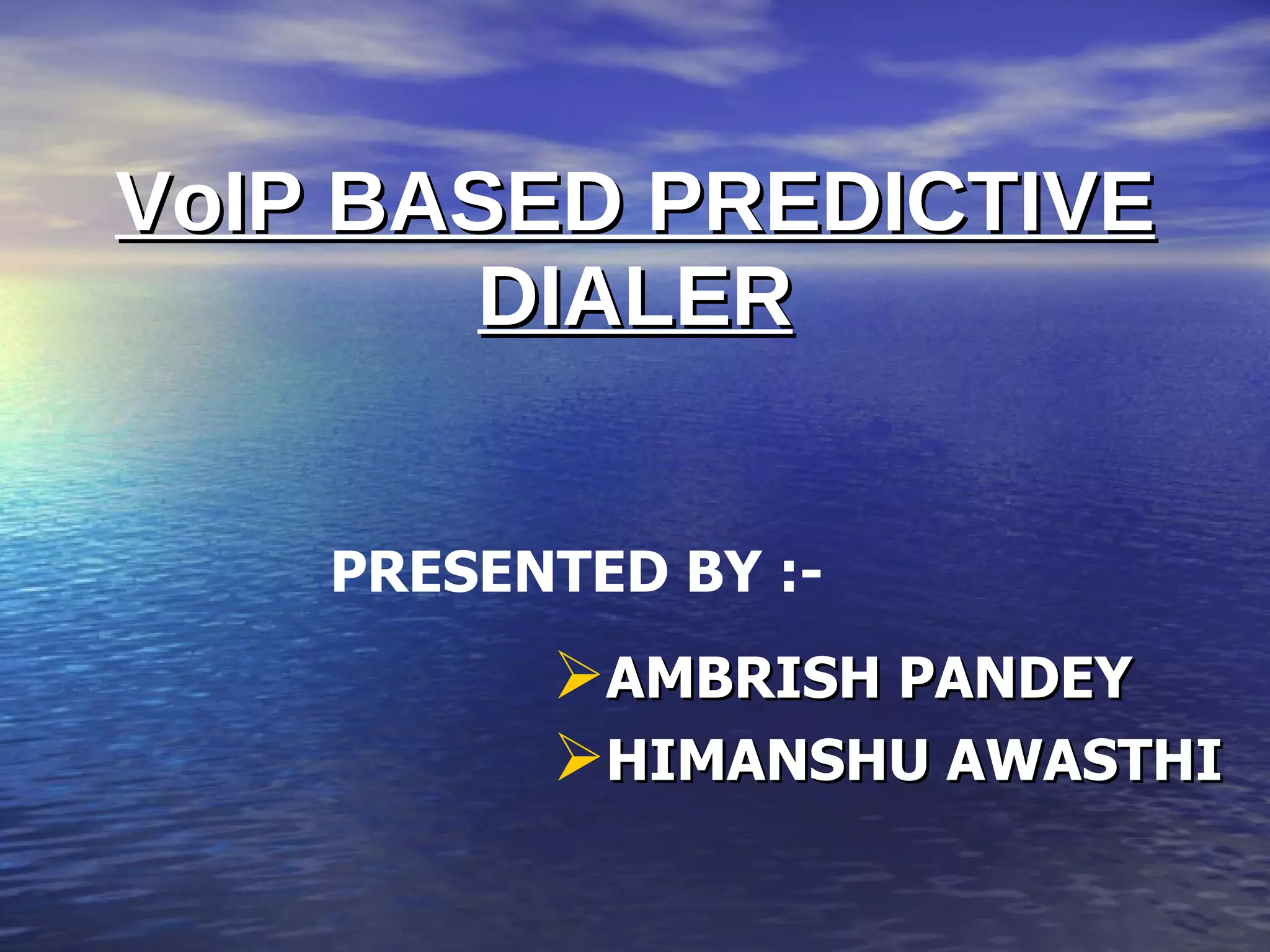 This document discusses VoIP and predictive dialers. It begins with an introduction to VoIP, how it works, and some challenges. It then discusses features of VoIP like making calls anywhere in the world. Predictive dialers are then introduced as widely used in call centers to automatically dial batches of phone numbers for agents. The document explains how predictive dialers work by dialing ahead of available agents to increase productivity by 200-300% compared to manual dialing.