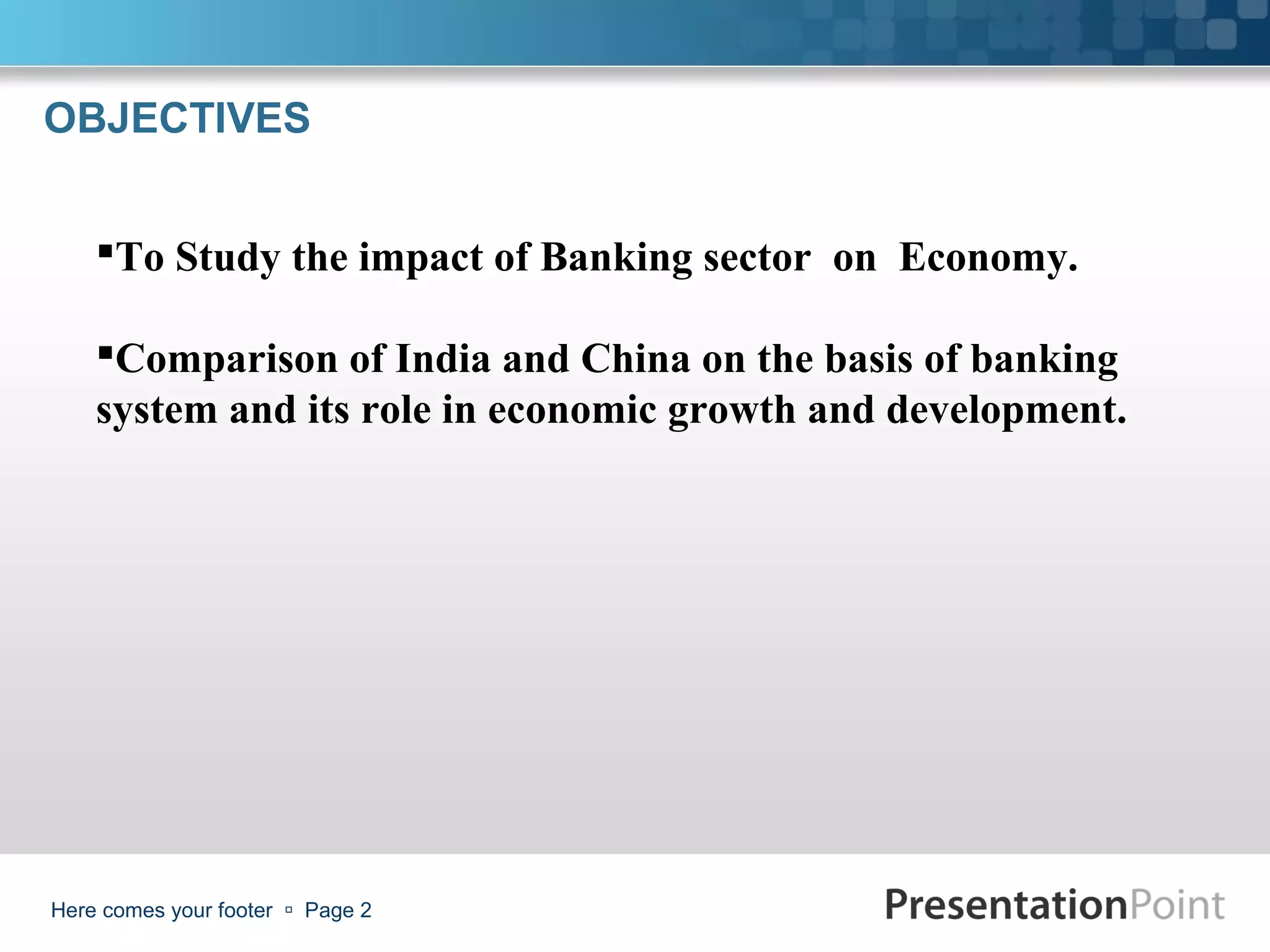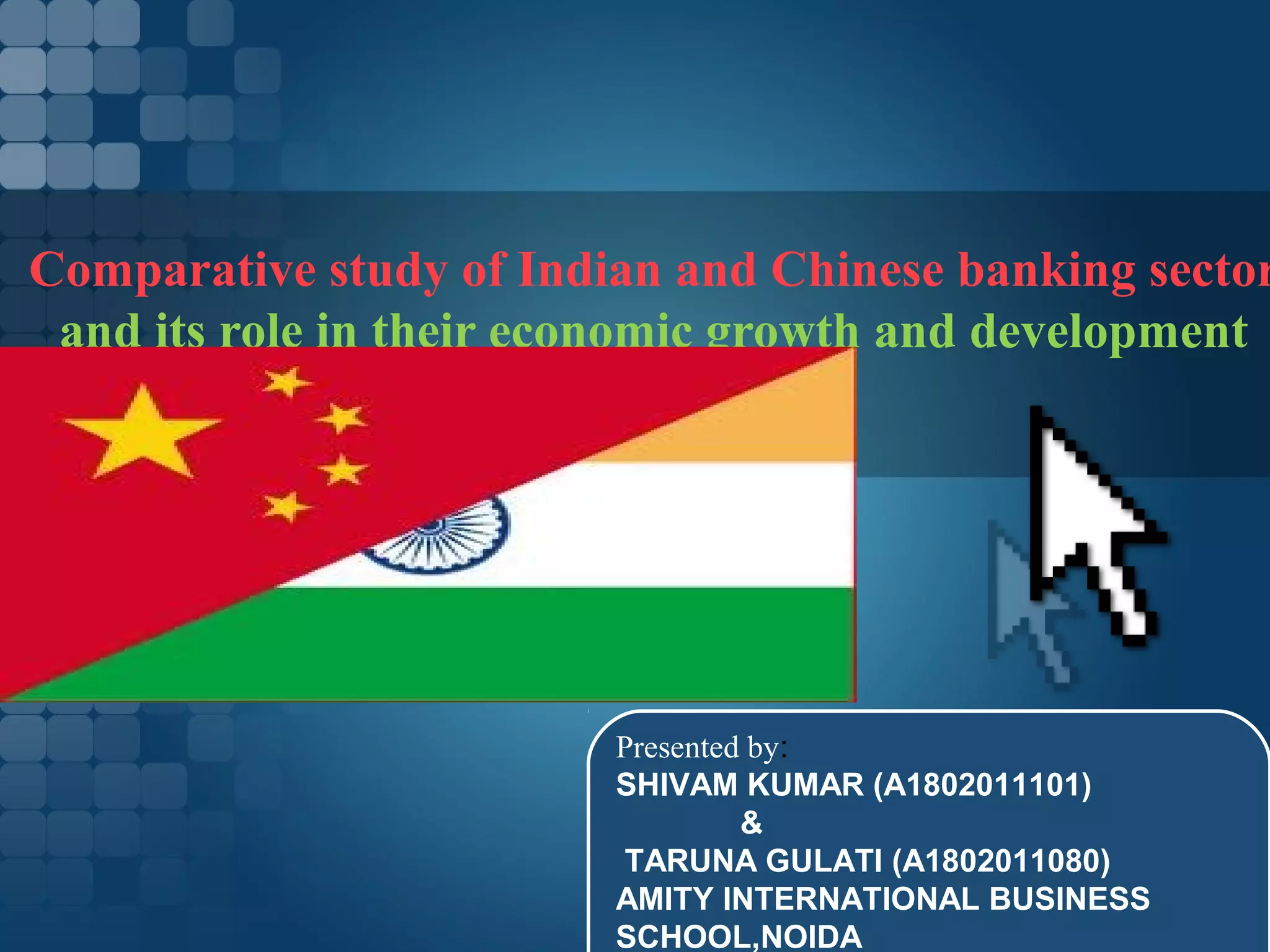This document presents a comparative study of the banking sectors in India and China and their role in economic growth and development. It finds that GDP and bank deposits are highly correlated with economic growth in both countries. It recommends that India and China increase savings, investments, and bank deposits to further strengthen their economies and increase GDP.