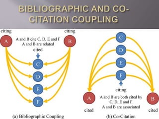 The document discusses citation analysis and its importance in measuring the quality and impact of research. Citation analysis evaluates the citations received by research papers, scientists, universities, and countries as a measure of scientific influence and productivity. Citations serve several purposes, such as acknowledging prior work, substantiating claims, and showing consideration of different opinions. Co-citation coupling and bibliographic coupling are methods to establish relationships between scholarly works based on their citations. Common citation metrics include the h-index and impact factor, which provide ways to quantify the impact of research, though they also have limitations. Overall, citation analysis through various metrics is an objective way to determine how influential and important a piece of research has been to the scientific community.
