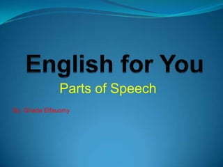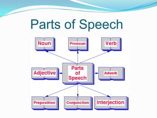 The document defines and provides examples of the eight parts of speech in English: nouns, pronouns, verbs, adjectives, adverbs, prepositions, conjunctions, and interjections. Nouns name people, places, or things. Pronouns are used in place of nouns. Verbs express actions or states of being. Adjectives provide details about nouns. Adverbs modify verbs, adjectives, or other adverbs. Prepositions show relationships of time, place, or other abstract concepts. Conjunctions join words and sentences. Interjections express emotions.