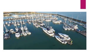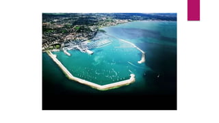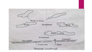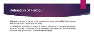 This document provides definitions and classifications of harbors and docks. It defines a harbor as a partially enclosed body of water that provides safe anchorage for boats. Harbors are classified based on their level of natural protection, utility, and location. Docks are enclosed areas for berthing ships and are classified as wet docks for loading/unloading or dry docks for ship repairs. Key harbor requirements include sufficient depth and anchorage space. Ideal harbor sites have favorable marine conditions and foundation soil to support structures.