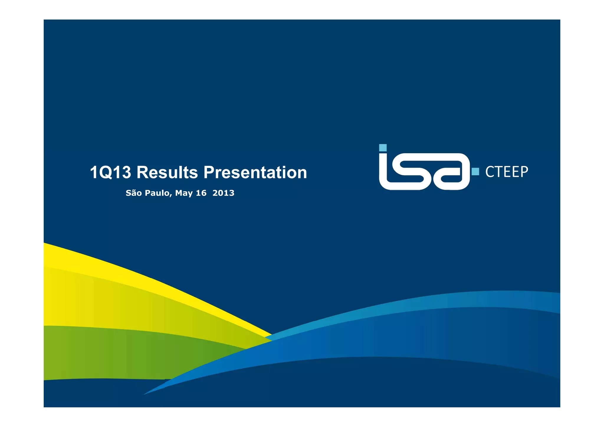 The document provides an overview of CTEEP's 1Q13 results. It summarizes that CTEEP's gross operating revenue declined 61.9% year-over-year to R$195.9 million in 1Q13. EBITDA fell 84.0% to R$51.6 million, with margins decreasing from 73.0% to 31.0%. Net income declined 65.4% to R$71.0 million. CTEEP's stock prices on the Brazilian stock exchange fell in 1Q13, with TRPL3 shares down 3.62% and TRPL4 shares down 7.55%. The document also reviews CTEEP's debt levels, capital expenditures, and operating metrics
