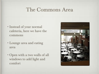 The document provides an overview of the facilities at Grafton High School. It describes several key areas of the school including the commons area which has a lounge and eating space with large windows, a 670-seat auditorium with catwalks and elevators for accessibility, wide hallways to avoid traffic, a regulation-size gymnasium with retractable bleachers, outdoor athletic facilities including two turf fields and courts, a large library and computer lab for research and homework, and an interior design with architectural features like a spiral staircase. The school aims to provide relaxing, safe, and fun learning spaces for students.