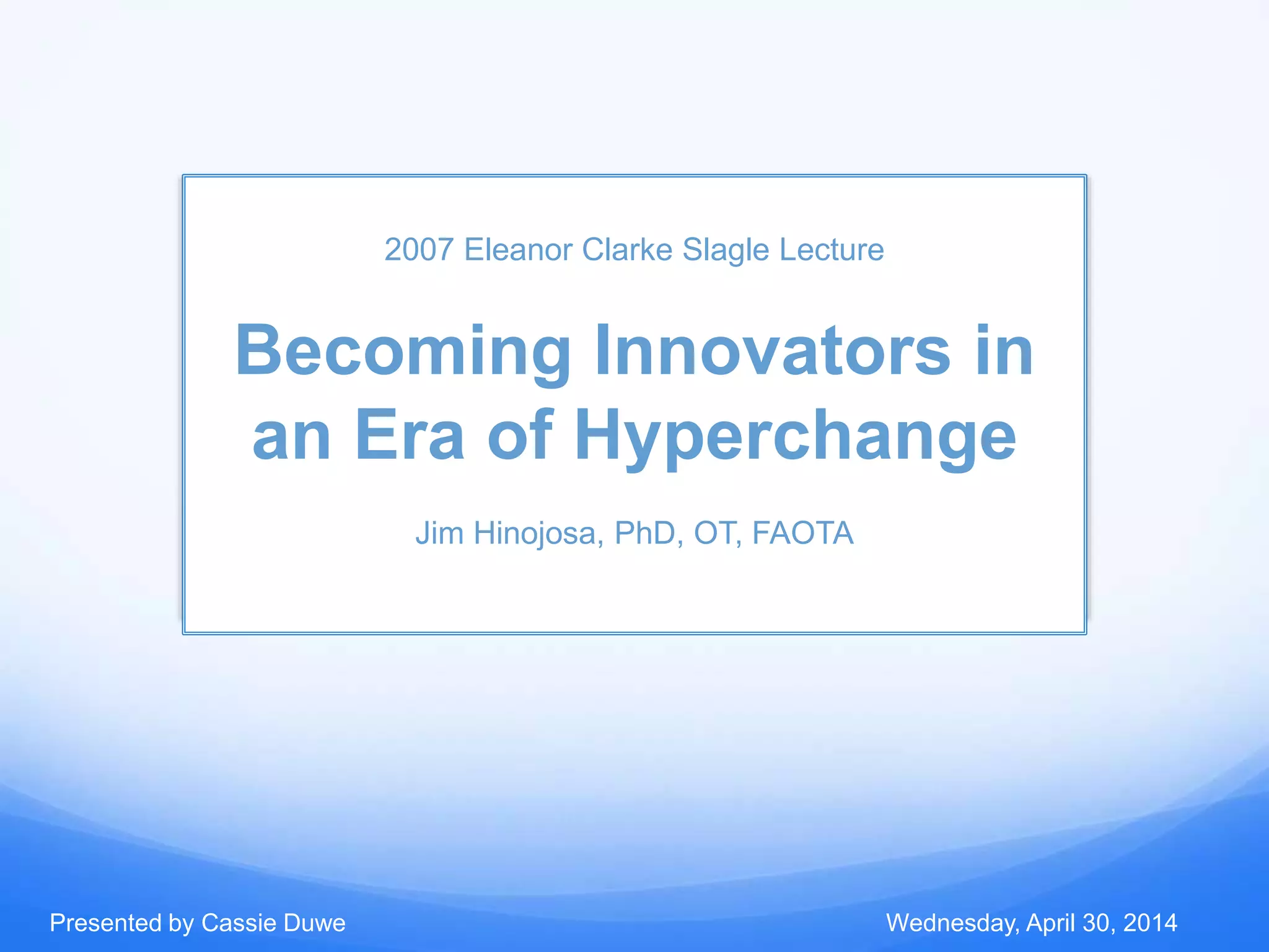 This document summarizes Jim Hinojosa's 2007 Eleanor Clarke Slagle Lecture on occupational therapy practitioners becoming innovators in an era of rapid change or "hyperchange". Hinojosa argues that the profession must shift its paradigms and thinking to deal with the increasing uncertainty, pace of change, ambiguity, and complexity characterizing the modern workplace. He identifies three key areas - professional organizations, education, and practice - that require innovation. Hinojosa urges occupational therapists to anticipate change, reflect on innovations, and consider new ideas outside their typical thought processes in order to lead the profession successfully through hyperchange.
