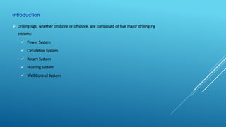 The document outlines the major systems of drilling rigs, including the power, circulation, rotary, hoisting, and well control systems. Each system is described with its components and functions, such as the power system powering the rig, the circulation system managing drilling fluids, and the well control system preventing undesired fluid release. Additionally, it briefly mentions future topics related to drilling bits.