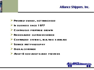 Alliance Shippers is a privately owned transportation and logistics company that has been in business since 1977. It provides domestic and global transportation services through various subsidiaries, including freight forwarding, truckload, intermodal, refrigerated transport, and warehousing. Alliance Shippers aims to provide its customers with the most efficient transportation services worldwide through continuous improvements and a focus on customer service.