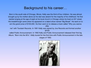R. Kelly had a difficult childhood growing up in Chicago but found success as a singer in his local church. He broke through after winning a talent show and releasing a track with Tavdash Records. In the early 1990s, Kelly formed the group Public Announcement and released their debut album in 1992. Kelly's 1993 solo debut album "12 Play" was a major success, with his first number one hit "Bump'n Grind" topping the charts for 12 weeks. Initially seen as a clean-cut artist making inspirational songs, Kelly's image changed as his career progressed and he began making more explicit R&B songs, though his image and career were damaged by legal issues in the 2000s. While still