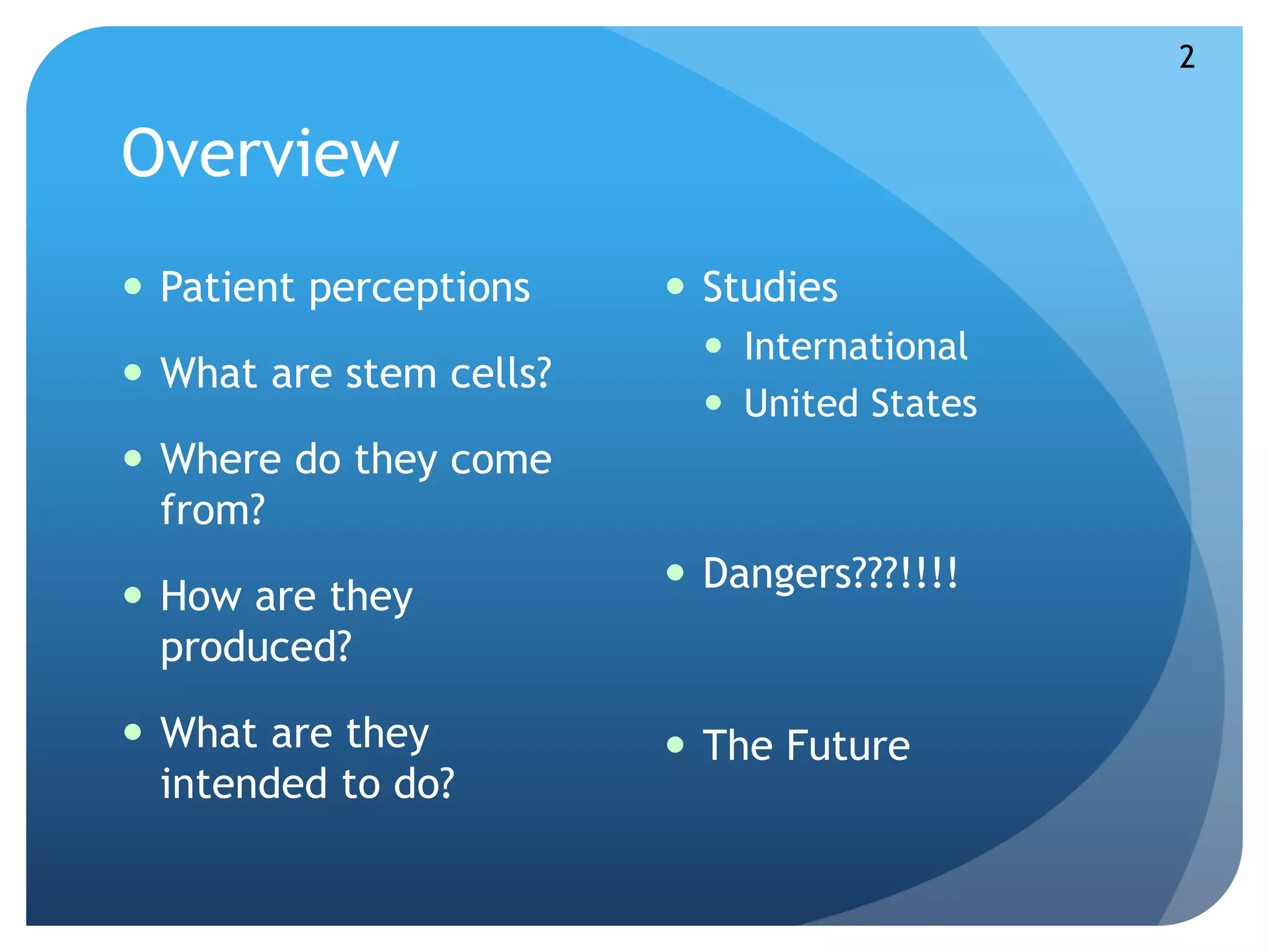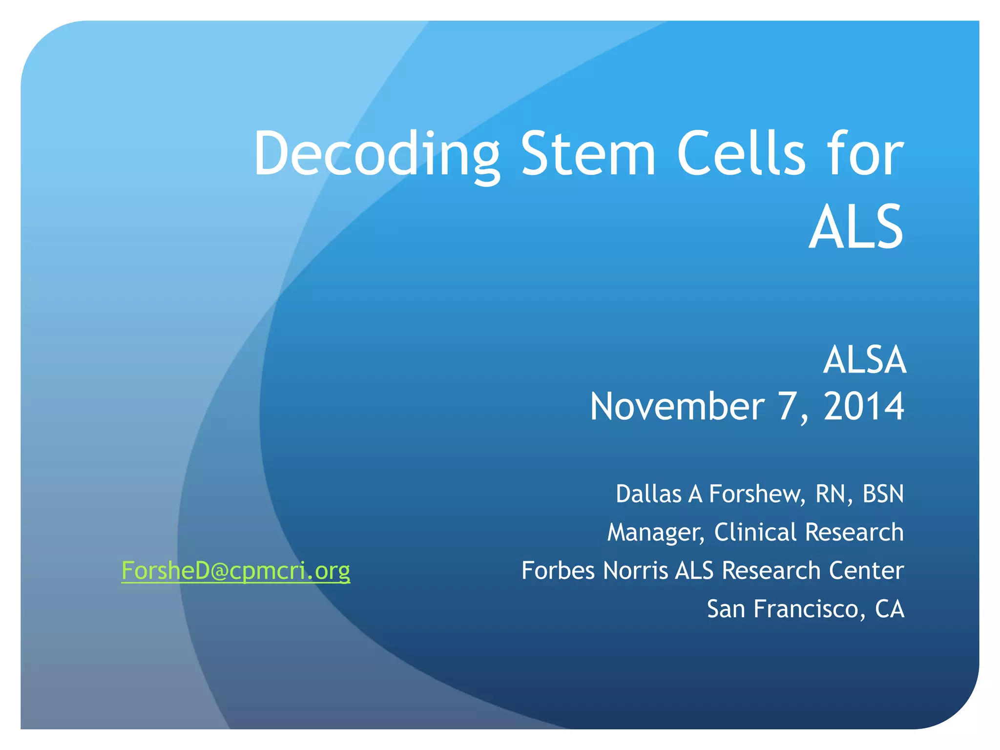 This document summarizes stem cell research for ALS and patient perspectives. It describes the different types of stem cells (adult, embryonic, induced pluripotent), their purposes in ALS (replacing motor neurons or supporting cells), and several clinical trials testing stem cells for ALS in the US and internationally. While patients have high expectations for cures, the document cautions that progress will be slow and individualized therapies may be needed given ALS is likely a syndrome. It outlines sources of information for patients and considerations like safety for stem cell interventions.