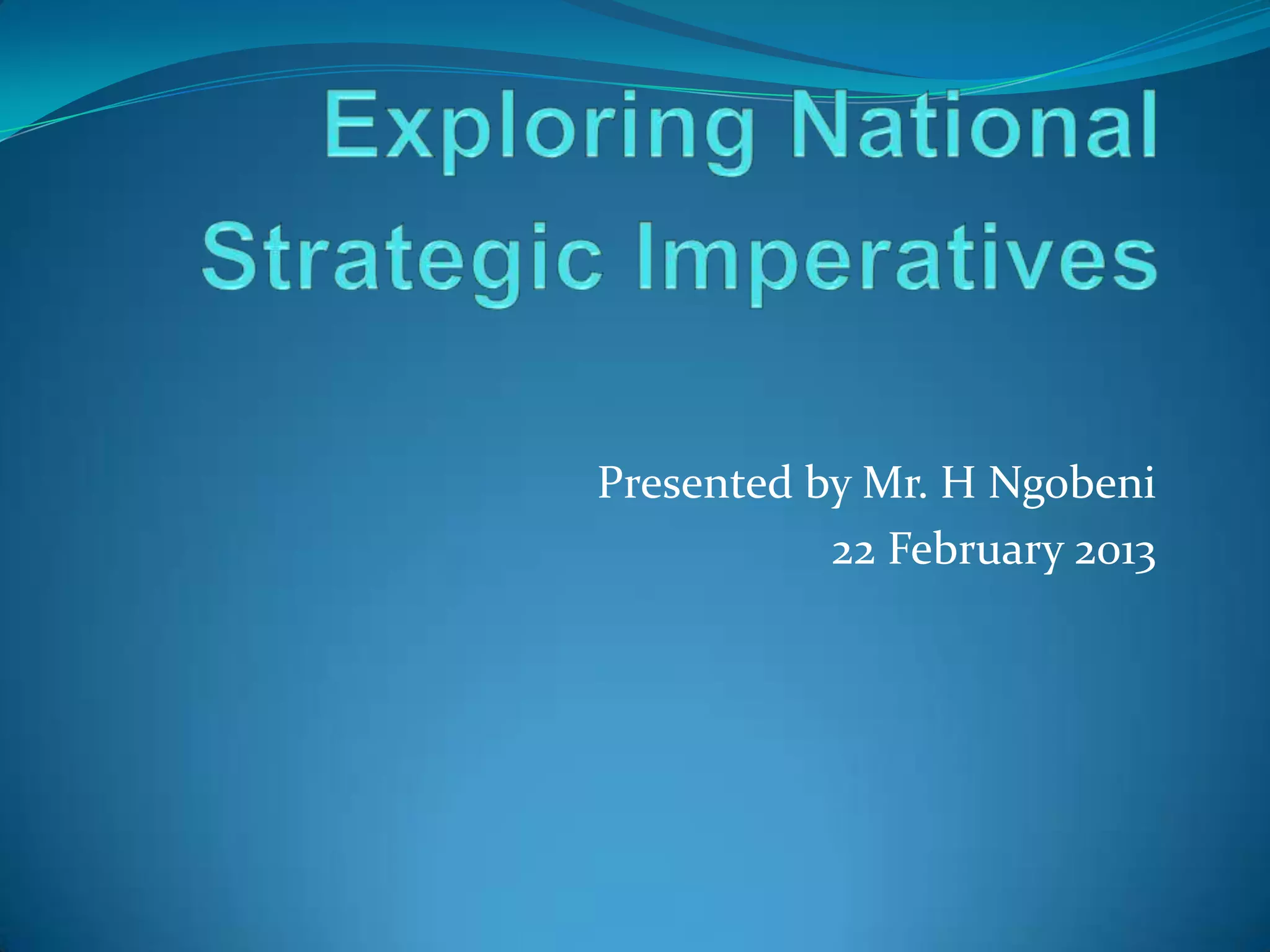 The document outlines South Africa's national strategic objectives for education from 2011-2014, which include improving administration, the curriculum, teacher development, and planning/assessment. It discusses using information and communication technologies (ICTs) to develop knowledge societies and achieving education for all through goals like gender equity and improving quality. Teacher competency standards for integrating ICT into teaching are also presented.