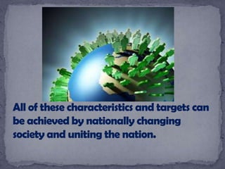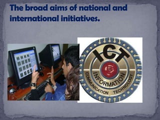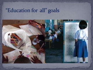 This document discusses the knowledge society and the role of teachers within it. It defines knowledge and outlines national imperatives like justice, solidarity, democracy, and peace. The knowledge society requires new types of knowledge beyond traditional disciplines. Schools will involve new conceptions of teaching using interactive content. Teachers will need new competencies to deal with changing knowledge, discover new ways of accessing information, and be involved in international networks. The document also discusses goals for education for all and improving teacher training.